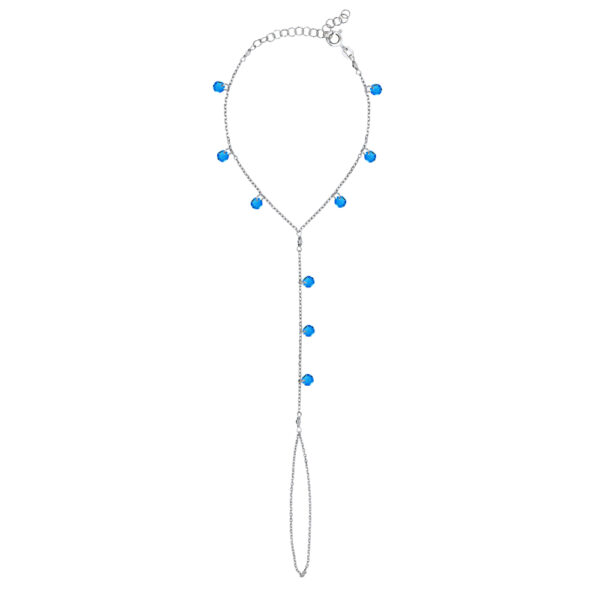 Bransoletka na wierzchnią część dłoni, ozdobiona kryształkami Swarovski.Bransoletka wykonana ze srebra 925 oraz pokryta warstwą rodu. Długość bransoletki wokół nadgarstka: 16-20 cm. Długość od nadgarstka do palca: 7.5 cm. Bransoletka na palec to delikatny łańcuszek opleciony wokół nadgarstka i środkowego palca. Idealny dla osób, którym znudziły się tradycyjne dodatki i w dziedzinie biżuterii poszukują nowych wrażeń.
