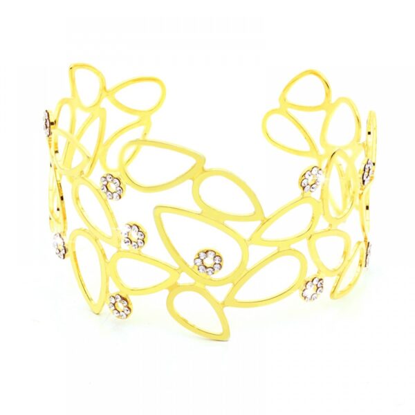 Bransoletka wykonana ze srebra próby 925 oraz pokryta grubą warstwą 18 karatowego złota. Szerokość bransoletki ok. 4 cm. Średnica bransoletki: 6 cm. Możliwa regulacja.