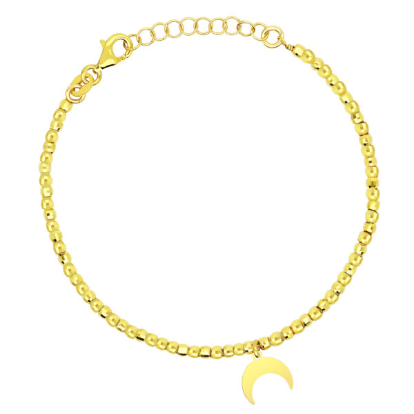 Bransoletka wykonana ze srebra próby 925. Bransoletka dodatkowo uszlachetniona 3 mikronami 24 karatowego złota. Wielkość księżyca: 10×10 mm. Długość bransoletki: 16-19 cm. Koralikowe bransoletki to musthave tego sezonu ! To modna ozdoba damskiego nadgarstka. Świetnie prezentują się noszone samodzielnie, w zestawieniu z zegarkiem lub połączone kilka razem. Bransoletka ta idealnie uzupełni Twoją kolekcję biżuterii ! Bransoletka pięknie mieni się w każdym świetle nadając blasku Twojej stylizacji.