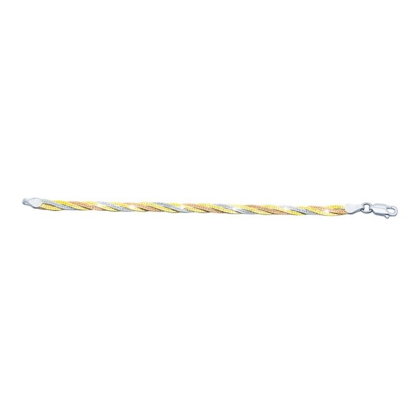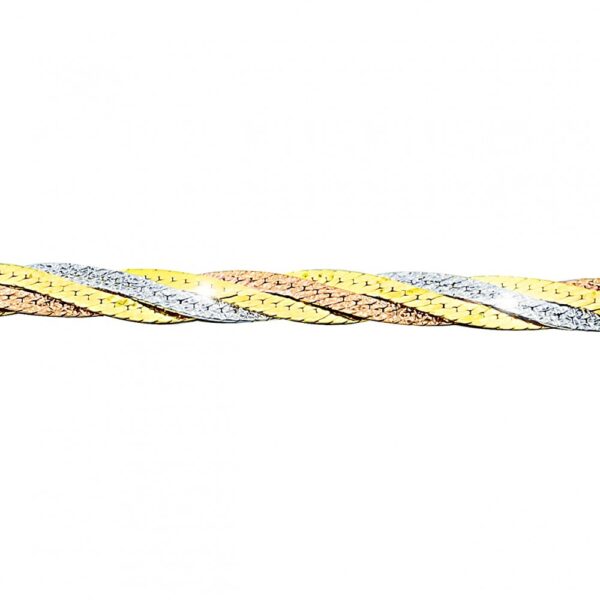 Bransoletka pleciona wykonana ze srebra próby 925. Bransoletka wykonana z łańcuszków ozdobnych delikatnym szlifem. Bransoletka pokryta 3 warstwami 24 karatowego złota w odcieniu żółtym oraz różowym. Długość bransoletki: 18 cm.