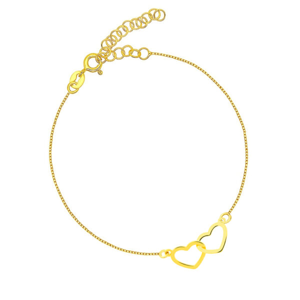 Bransoletka srebrna pozłacana splecione serca wykonana z najwyższej próby srebra 925 – bez dodatku niklu, nie uczula. Biżuteria pokryta 3 warstwami 24 karatowego złota. Łańcuszek o splocie kostka, o długości 16-20 cm. Splot kostka jest jednym z mocniejszych splotów odpornym na zerwania oraz uszkodzenia. Bransoletka ozdobiona zawieszkami w kształcie dwóch splecionych serduszek o gładkiej powierzchni, które przepięknie odbijają światło. Wyrób jubilerski wysokiej jakości wykonany przez mistrzów jubilerstwa z ogromną precyzją oraz dbałością o detale.