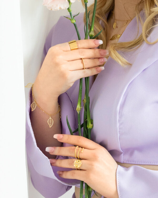 Motyw liści, delikatnie i precyzyjnie odwzorowany, nadaje wyjątkowy charakter tej wyrafinowanej biżuterii. Symbolizując wzrost, odnowę i życie, liście dodają nie tylko estetycznego uroku, ale także głębokiej symboliki do tej bransoletki.