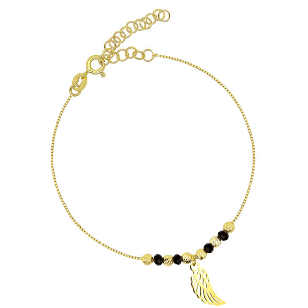 Bransoletka srebrna pozłacana ze skrzydłem i czarnymi koralikami