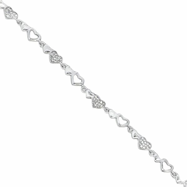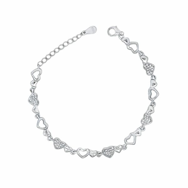 Najbardziej charakterystycznym elementem bransoletki jest sekwencja serc występujących w trzech starannie zaprojektowanych wariantach. Pierwszy z nich to pełne serca, bogato wysadzane bezbarwnymi cyrkoniami o brylantowym szlifie, osadzonymi w technice pave. Gęsto rozmieszczone kamienie tworzą efekt jednolitej, lśniącej tafli, która intensywnie odbija światło i przyciąga wzrok.