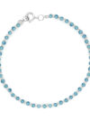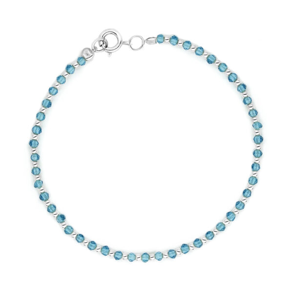 Bransoletka srebrna z kuleczkami oraz niebieskimi kryształkami. Biżuteria wykonana z najwyższej próby srebra 925 – bez dodatku niklu, nie uczula. Bransoletka o długości 17,5 cm. Wyrób jubilerski ozdobiony niebieskimi kryształkami swarovskiego.