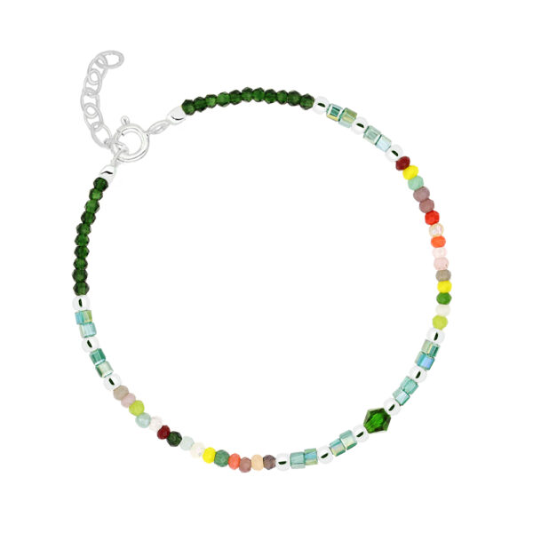 Bransoletka srebrna zielone oraz kolorowe kryształkami swarovskiego wykonana z najwyższej próby srebra 925 – bez dodatku niklu, nie uczula. Długość regulowana: 17-20 cm. Biżuteria ozdobiona kolorowymi kryształkami swarovskiego.