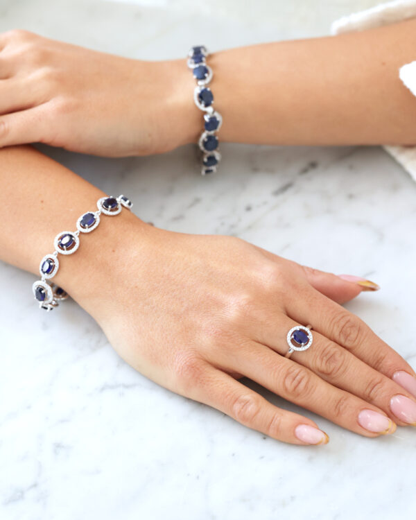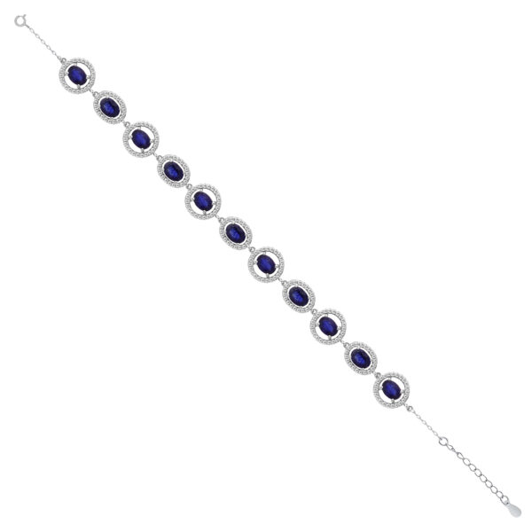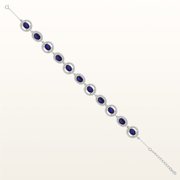 Bransoletka wysadzana szafirami oraz cyrkoniami srebrna wykonana z najwyższej próby srebra 925 – bez dodatku niklu, nie uczula. Biżuteria dodatkowo pokryta 3 warstwami szlachetnego rodu. Długość bransoletki regulowana: 19-21,5 cm. Bransoletka bogato ozdobiona naturalnymi szafirami o szlifie owal o wymiarach: 5x7mm. Wyrób jubilerski wysokiej jakości wykonany przez mistrzów jubilerstwa z ogromną precyzją oraz dbałością o detale.