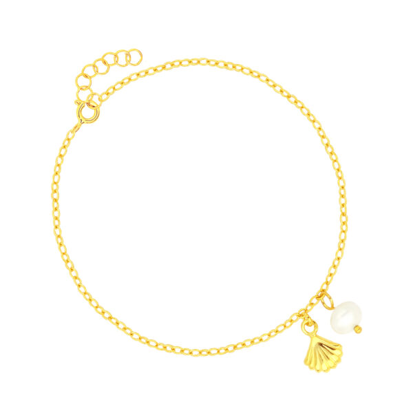 Bransoletka z zawieszkami perełka oraz muszelka srebrna pozłacana wykonana z najwyższej próby srebra 925 – bez dodatku niklu, nie uczula. Biżuteria pokryta 3 warstwami 24 karatowego złota. Bransoletka o regulowanej długości: 17-20cm. Precioza ozdobiona naturalną perłą hodowlaną słodkowodną o średnicy 6mm oraz zawieszką muszelką. Biżuteria najwyższej jakości, wykonana z precyzją i dbałością o każdy detal przez mistrzów sztuki jubilerskiej