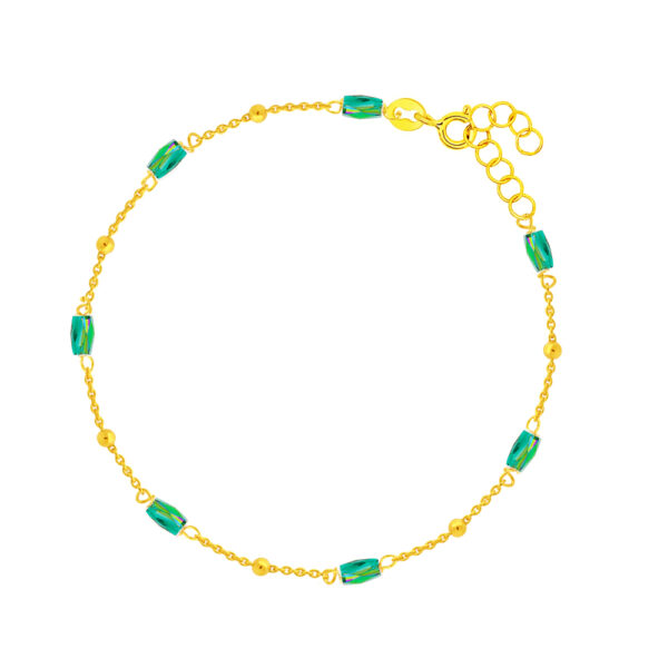 Bransoletka z zielonymi kryształkami srebrna pozłacana wykonana z najwyższej próby srebra 925 – bez dodatku niklu, nie uczula. Wyrób jubilerski pokryty 3 warstwami 24 karatowego złota. Długość bransoletki: 17-20 cm. Precioza ozdobiona zielonymi kryształkami swarovskiego. Biżuteria najwyższej jakości, wykonana z precyzją i dbałością o każdy detal przez mistrzów sztuki jubilerskiej.
