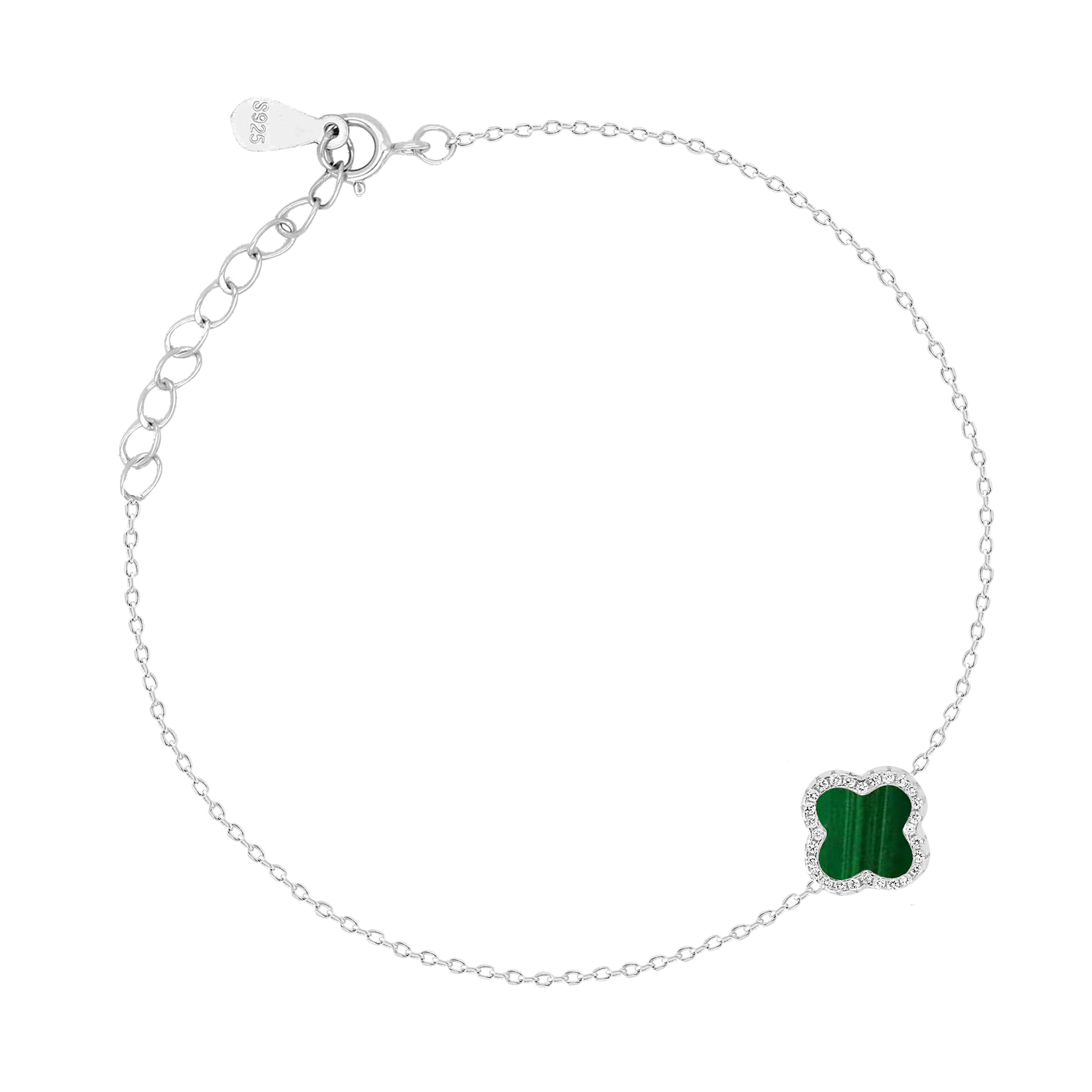 Bransoletka ze srebra o wyjątkowym designie, wzbudza zachwyt swoją elegancją i finezją. Jej wyjątkową cechą jest zielona koniczynka otoczona cyrkoniami.