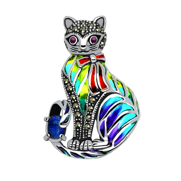 Broszka kot srebrna z kamieniem księżycowym markazytami i rubinami. Zawieszko-broszka wykonana z najwyższej próby srebra 925 – bez niklu, nie uczula. Biżuteria dodatkowo pokryta 3 warstwami szlachetnego rodu. Ozdobiona kamieniami naturalnymi – kamieniem księżycowym, rubinami oraz markazytami. Wielkość broszki: 2×3.5 cm.