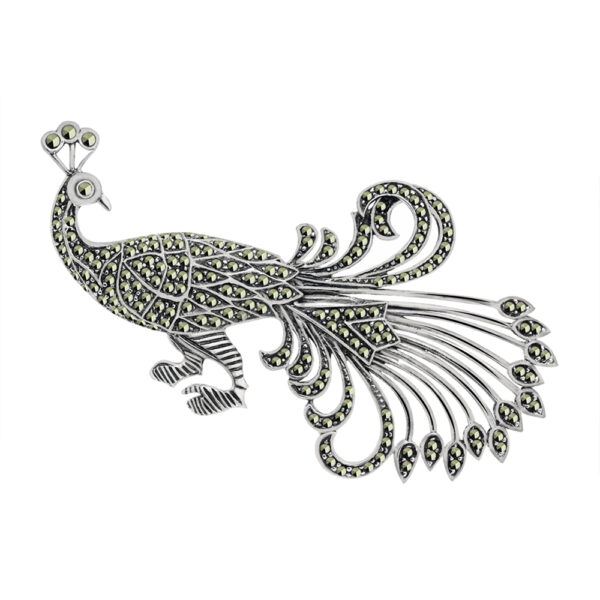 Broszka paw z markazytami srebrna. Broszka wykonana z najwyższej próby srebra 925 – bez dodatku niklu, nie uczula. Biżuteria oksydowana. Wyrób jubilerski wykonany z ogromną precyzją i kunsztem jubilerskim ozdobiony kamieniami naturalnymi markazytami.