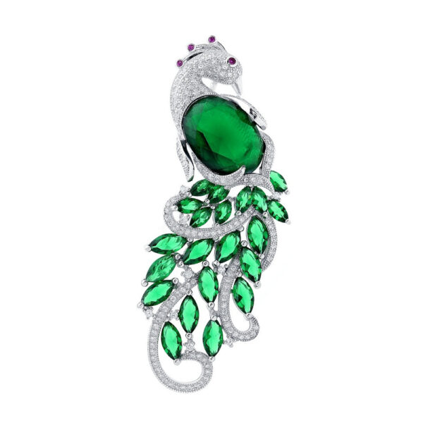 Ogon pawia jest szczególnie uwypuklony i zdobiony, aby przyciągał uwagę. Broszka posiada dużą, zieloną cyrkonię umieszczoną w centrum, która jest osadzona w srebrnym oprawieniu. Ta piękna cyrkonia przypomina intensywność i naturalne piękno piór pawia.