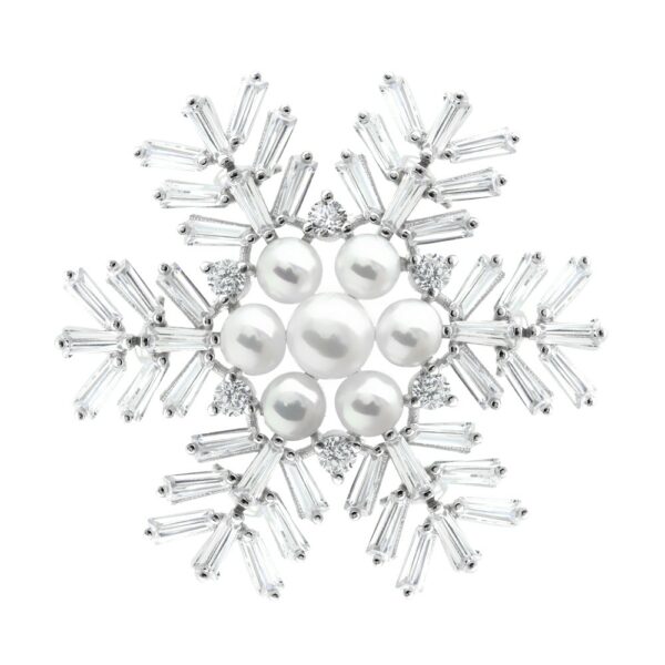 Broszka srebrna śnieżynka z perłą wykonana z najwyższej próby srebra 925 – bez niklu, nie uczula. Biżuteria dodatkowo pokryta 3 warstwami szlachetnego rodu. Wielkość broszki: 40×40 mm.