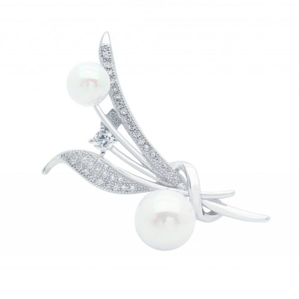 Broszka srebrna z cyrkonią i perłą wykonana z najwyższej próby srebra 925 – bez niklu, nie uczula. Biżuteria dodatkowo pokryta 3 warstwami szlachetnego rodu. Wielkość broszki: 40×20 mm. Nasza wyjątkowa broszka, jest prawdziwym klejnotem w Twojej kolekcji biżuterii. Ozdobiona lśniącymi cyrkoniami i perłami Swarovskiego emanuje klasyką i luksusem.