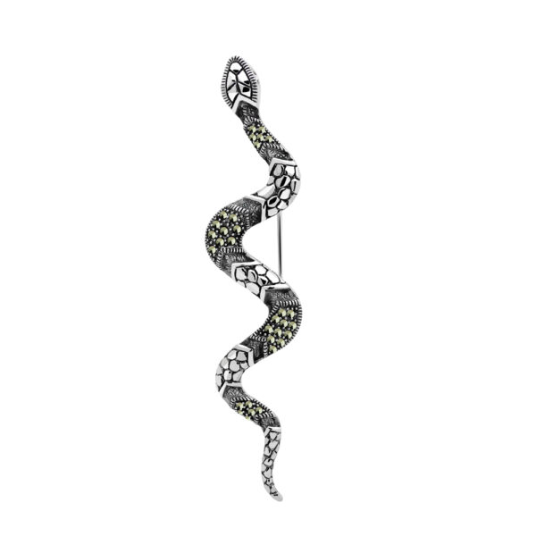 Broszka wąż z markazytami srebrna. Broszka wykonana z najwyższej Próby Srebra 925 – bez dodatku niklu, nie uczula. Biżuteria oksydowana. Wielkość broszki: 87x20mm. Wyrób jubilerski ozdobiony kamieniami naturalnymi markazytami.
