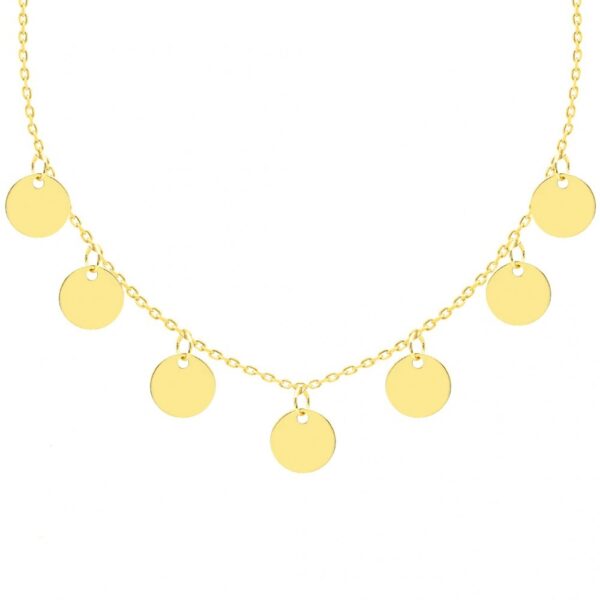 Naszyjnik typu choker wykonany ze srebra próby 925, dodatkowo pokryty warstwą 24 karatowego złota. Długość chokera 35-39 cm. Wielkość zawieszek ok. 10×10 mm.