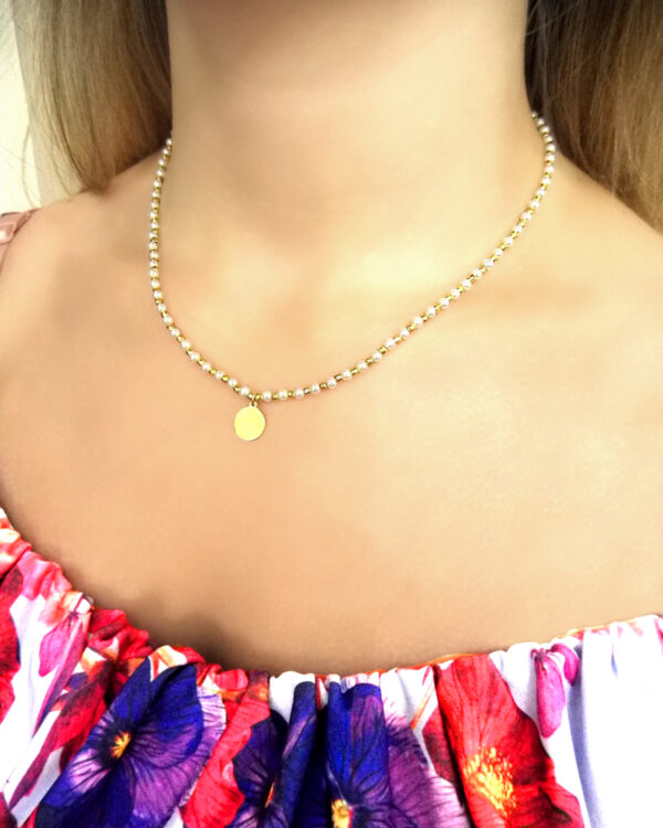 Choker na szyję srebrny pozłacany z blaszką i perełkami