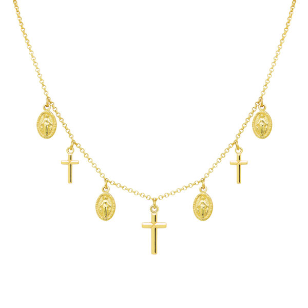 Choker na szyję srebrny pozłacany z krzyżami i medalikami