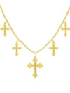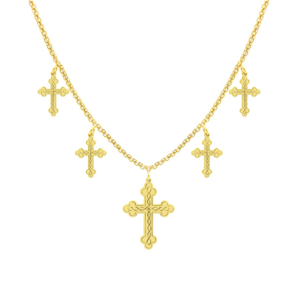 Naszyjnik Choker z Krzyżami wykonany ze Srebra Próby 925. Naszyjnik uszlachetniony 2 mikronami 24 karatowego złota. Długość Chokera: 38-43 cm. Naszyjnik Choker ozdobiony zawieszkami w kształcie Krzyży. Wysokość krzyżyków 25-15 mm. Jego wyjątkowy design podkreśli Twoją stylizację nadając jej wyrazistego charakteru. Naszyjnik Choker to świetny dodatek do Twojej kolekcji biżuterii! Naszyjnik Choker z Krzyżami doskanale sprawdzi się w dziennej jak i wieczornej stylizacji. Naszyjnik Choker to absolutny Must Have tego sezonu!