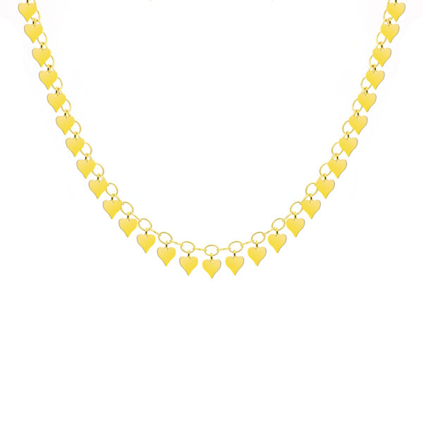Naszyjnik Choker Wiszące Blaszki Serduszka wykonany z najwyższej Próby Srebra 925 – bez dodatku niklu, nie uczula. Naszyjnik pokryty 3 warstwami 24 karatowego złota. Długość naszyjnika: 43,5 – 46,5 cm. Wielkość Serduszka: 6mm.