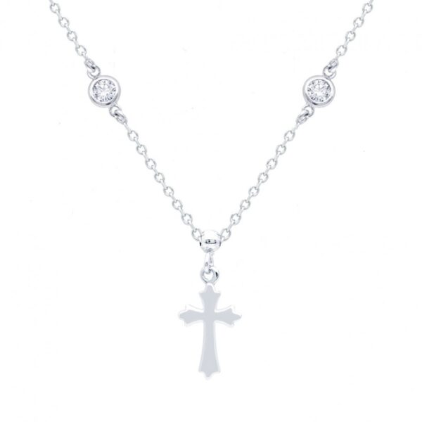 Naszyjnik typu choker wykonany ze srebra próby 925, dodatkowo uszlachetniony rodem. Długość chokera 35-40 cm. Wielkość zawieszek ok. 10×10 mm. Wielkość krzyżyka 15×10 mm.