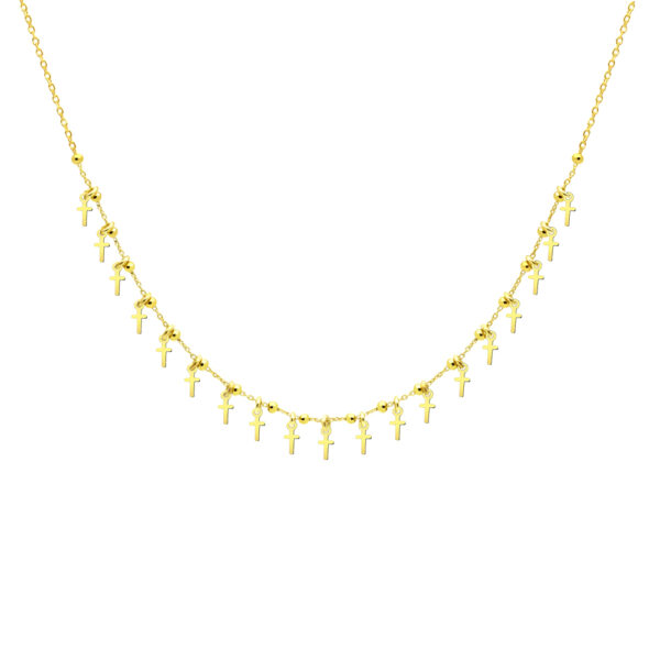 Naszyjnik Choker z Krzyżami wykonany ze Srebra Próby 925. Naszyjnik uszlachetniony 3 mikronami 24 karatowego złota. Długość Chokera: 36-40 cm. Naszyjnik Choker ozdobiony zawieszkami w kształcie Krzyży. Wielkość Krzyży: 5×3 mm. Motyw Krzyży to jeden z najmodniejszych wzorów tego sezonu. Jego wyjątkowy design podkreśli Twoją stylizację nadając jej wyrazistego charakteru. Naszyjnik Choker to świetny dodatek do Twoich stylizacji! Naszyjnik Choker to absolutny Must Have tego sezonu!