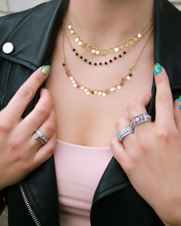 Naszyjnik Choker z Kółkami wykonany ze Srebra Próby 925. Naszyjnik uszlachetniony 3 mikronami 24 karatowego złota. Długość Chokera: 38-43 cm. Dwurzędowy Naszyjnik Choker ozdobiony Kryształkami Swarovskiego oraz zawieszkami w kształcie Kółek/Blaszek. Jego wyjątkowy design podkreśli Twoją stylizację nadając jej wyrazistego charakteru. Naszyjnik Choker z Kółkami doskonale uzupełni dzienną jak i wieczorną stylizację! Naszyjnik Choker to absolutny Must Have tego sezonu!