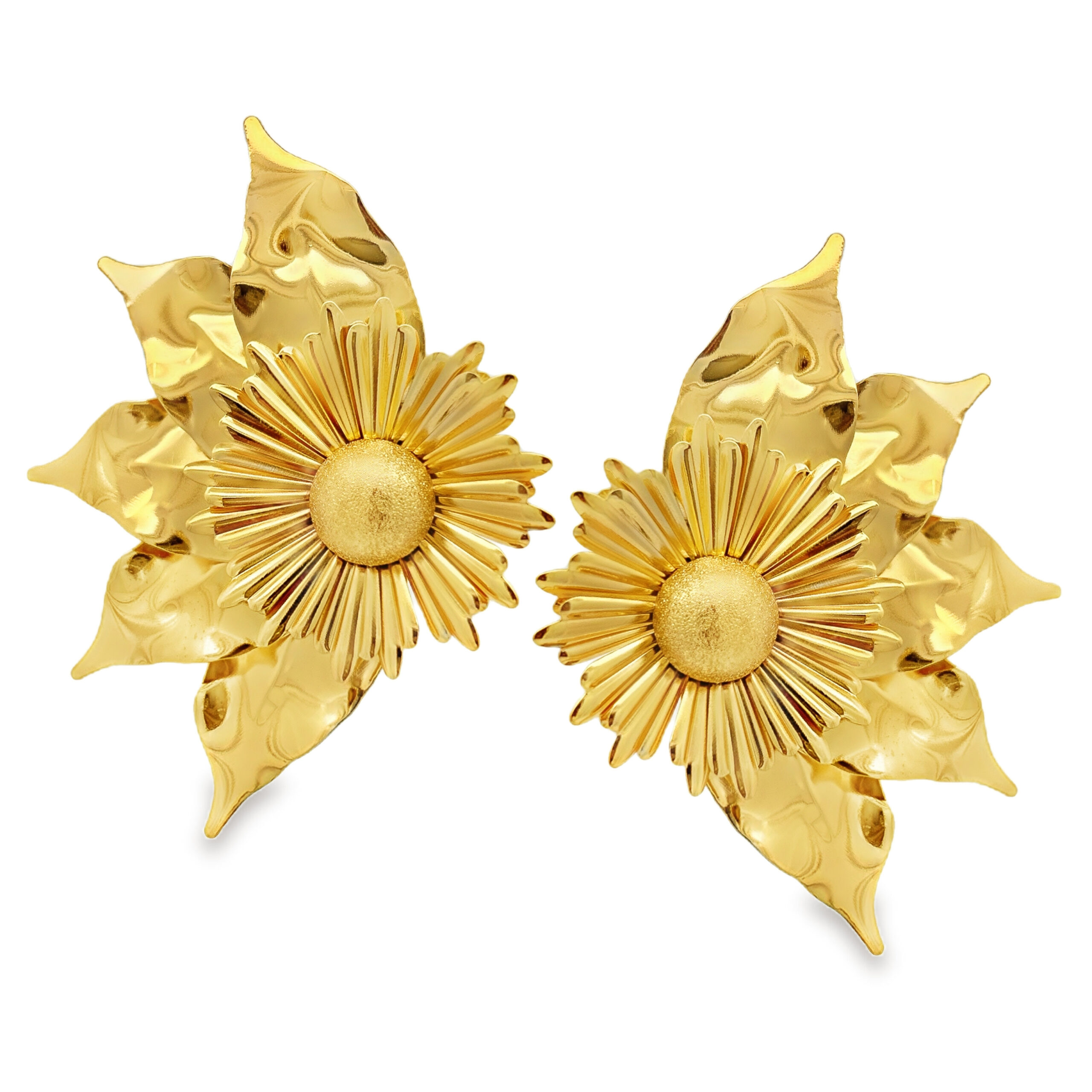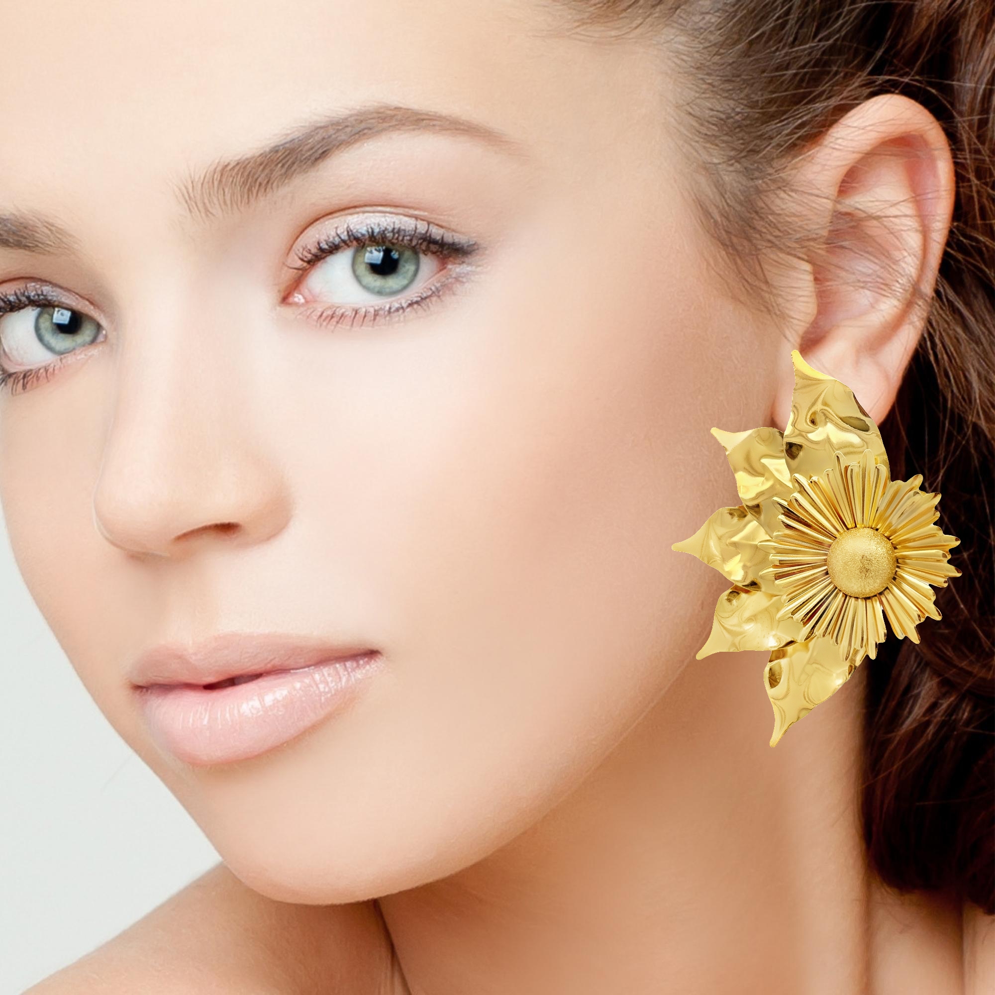 Te spektakularne kolczyki w kształcie dużych, rzeźbionych kwiatów to prawdziwe dzieło sztuki jubilerskiej. Ich trójwymiarowa forma i złocona, błyszcząca powierzchnia sprawiają, że wyglądają jak biżuteria prosto z wybiegu. To dodatek, który nie tylko ożywia stylizację, ale także przyciąga spojrzenia i podkreśla indywidualny styl.