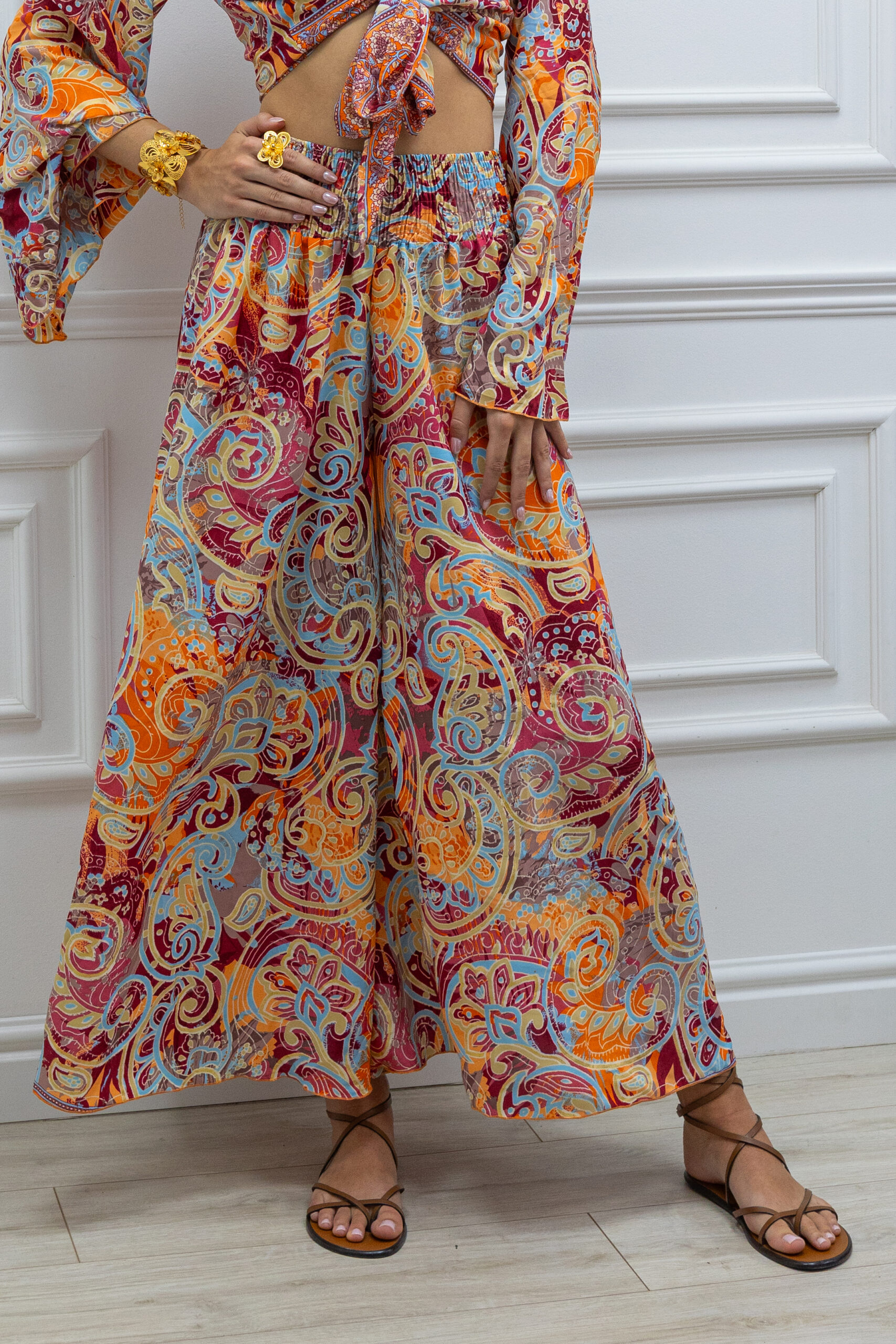 Wprowadź do swojej garderoby odrobinę egzotyki i luksusu. Te szerokie spodnie handmade powstały z najwyższej jakości 100% naturalnego jedwabiu, który otula skórę niczym delikatny dotyk. Ich orientalny print łączy energetyczną czerwień, soczystą pomarańczę i głęboki błękit, tworząc wzór, obok którego nie sposób przejść obojętnie.