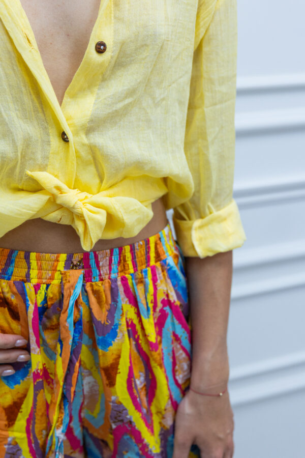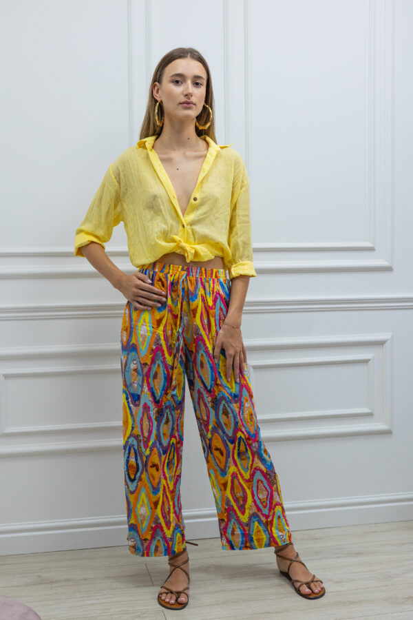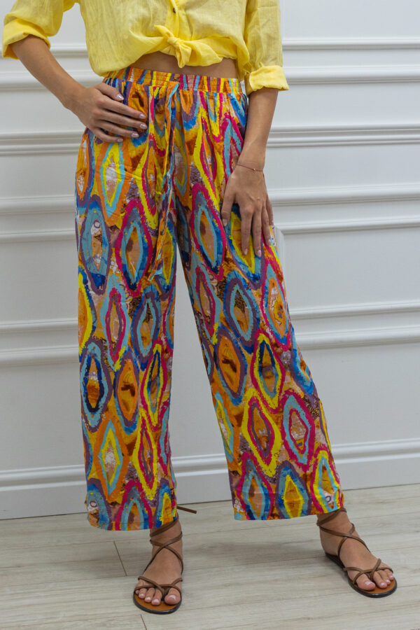 Print pełen barw – od intensywnych czerwieni i błękitów, po ciepłe żółcie i zielenie – nadaje spodniom wyjątkowego, artystycznego charakteru. To model, który z łatwością zestawisz z prostym topem lub koszulą, tworząc look idealny na wakacje, festiwal czy letni spacer po mieście.