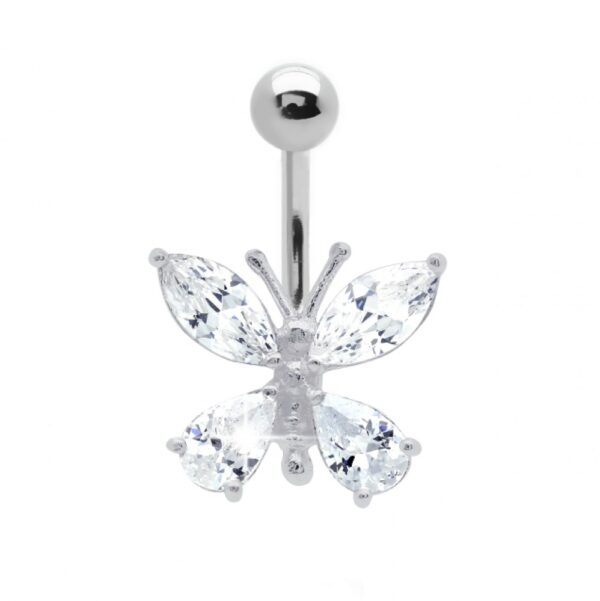 Kolczyk do pępka wykonany ze srebra próby 925. Górna część kolczyka wykonana ze stali chirurgicznej. Kolczyk ozdobiony białą cyrkonią. Wysokość części ozdobnej: 12 mm. Długość pręta: 10mm.