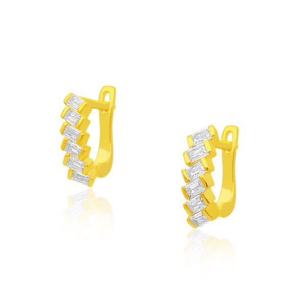 Kolczyki angielskie eleganckie z cyrkoniami srebrne pozłacane wykonane z najwyższej próby srebra 925 – bez dodatku niklu, nie uczulają. Biżuteria dodatkowo pokryta 3 warstwami 24 karatowego złota. Wysokość kolczyków: 15 mm. Zapinane na zapięcie angielskie. Kolczyki ozdobione białymi cyrkoniami o szlifie bagietka, o przejrzystości: AAAAA+, klasa pierwsza. Wysokiej klasy cyrkonia nadaje elegancki błyszczący efekt. Wyrób jubilerski wykonany z ogromną precyzją przez mistrzów jubilerstwa.