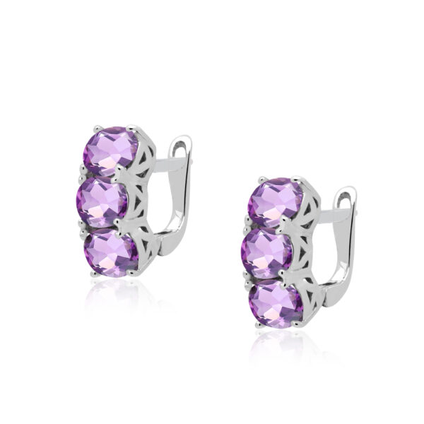 Kolczyki bogato ozdobione ametystem srebrne wykonane z najwyższej próby srebra 925 – bez dodatku niklu, nie uczulają. Biżuteria dodatkowo pokryta 3 warstwami szlachetnego rodu. Wysokość kolczyków: 17 mm. Zapinane na zapięcie angielskie. Wielkość kamieni: 6x8mm. Kolczyki bogato ozdobione naturalnymi szlachetnymi ametystami o szlifie owalnym. Wyrób jubilerski wysokiej jakości wykonany przez mistrzów jubilerstwa z ogromną precyzją oraz dbałością o detale.