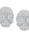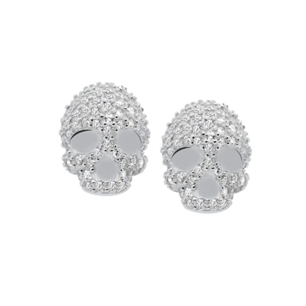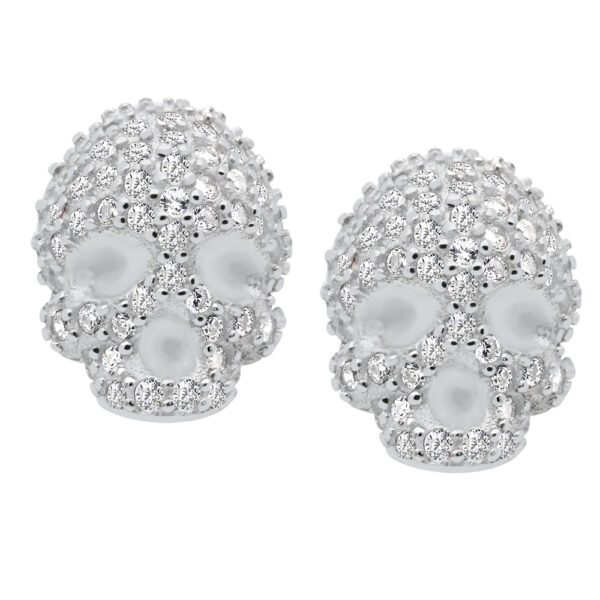 Kolczyki czaszki wykonane ze srebra próby 925, uszlachetnione warstwą rodu. Kolczyki ozdobione białą cyrkonią. Kolczyki zapinane na sztyft. Wymiary: 6×10 mm.