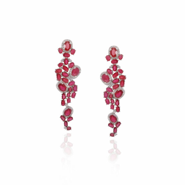 Kolczyki długie wiszące z rubinami i cyrkoniami srebrne wykonane z najwyższej próby srebra 925 – bez niklu, nie uczulają. Biżuteria dodatkowo pokryta 3 warstwami szlachetnego rodu. Kolczyki zapinane zapięcie typu zatrzask. Długość kolczyków: 68 mm. Bogato ozdobione kamieniami naturalnymi rubinami o szlifie owal. Wyrób jubilerski wysokiej jakości wykonany przez mistrzów jubilerstwa z ogromną precyzją oraz dbałością o detale.