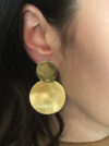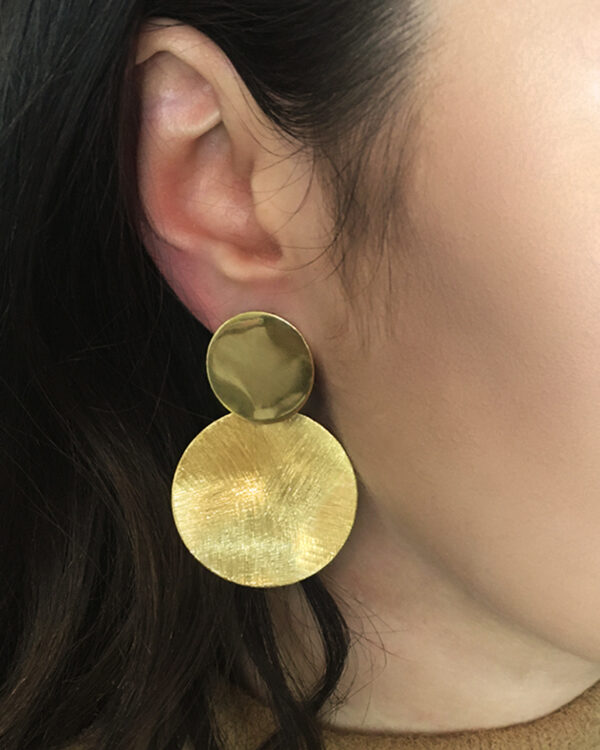 Kolczyki Duże Podwójne Koła Satynowe wykonane z najwyższej Próby Srebra 925 – bez dodatku niklu, nie uczulają. Kolczyki pokryte 3 warstwami 24 karatowego złota. Długość kolczyków: 50×34 mm.