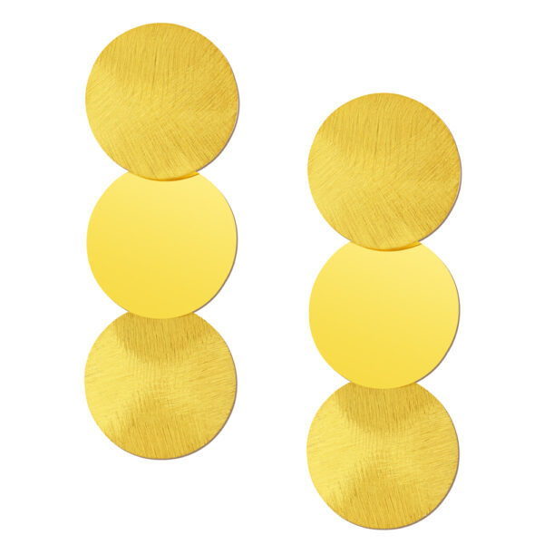 Kolczyki Duże Potrójne Koła Satynowe wykonane z najwyższej Próby Srebra 925 – bez dodatku niklu, nie uczulają. Kolczyki pokryte 3 warstwami 24 karatowego złota. Długość kolczyków: 70×25 mm. Kolczyki o bardzo nietypowym wzornictwie wykonane z ogromna starannością. Kolczyki z Szlifowanym Kółeczkiem przepięknie podkreślą charakter każdej stylizacji nadając jej Kobiecości oraz niepowtarzalnego szyku. Kolczyki charakteryzuje doskonały design i precyzja.