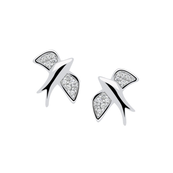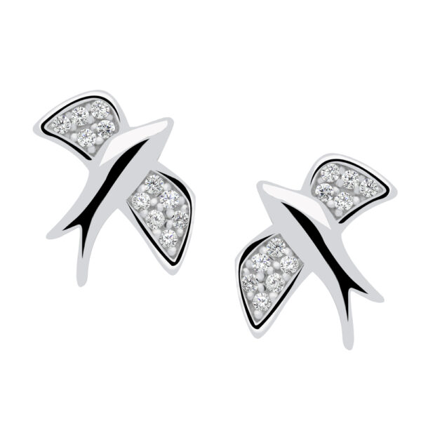 Kolczyki jaskółki wykonane ze srebra próby 925, uszlachetnione warstwą rodu. Kolczyki ozdobione białą cyrkonią. Kolczyki zapinane na sztyft. Wymiary: 6×10 mm.