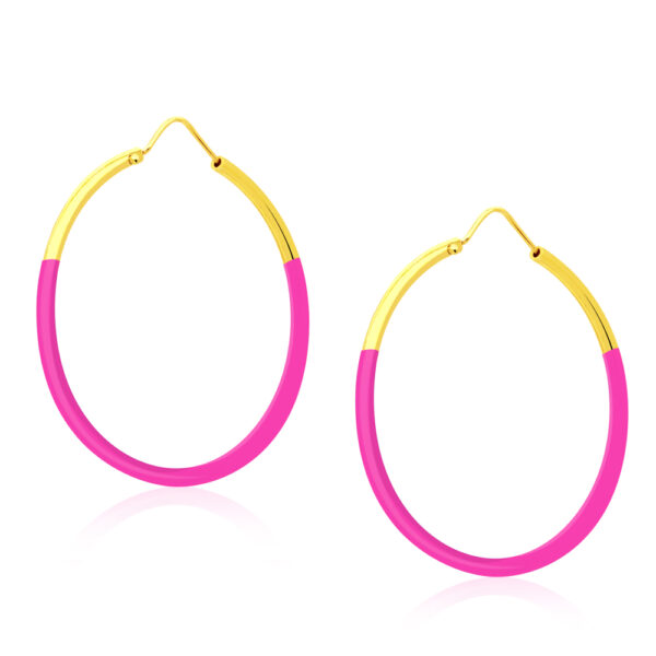 Kolczyki koła duże różowe srebrne pozłacane wykonane z najwyższej próby srebra 925 – bez dodatku niklu, nie uczulają. Kolczyki pokryte 3 warstwami 24 karatowego złota. Średnica kolczyków: 42mm. Biżuteria modowa ozdobiona różową emalią jubilerską. Precioza wykonana z ogromną precyzją przez mistrzów jubilerstwa.