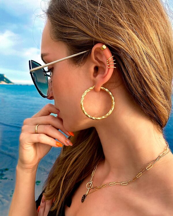 Wyrób jubilerski wykonany z ogromną precyzją przez mistrzów jubilerstwa. Wyjątkowość tych kolczyków polega na ich niespotykanej formie. Precioza przepięknie zdobi ucho połyskując pod wieloma kątami. Ponadczasowe kolczyki koła przepięknie podkreślą każda stylizację nadając jej szyku, kobiecości oraz zmysłowości. Kolczyki te będą stanowić niezastąpiony dodatek do każdego dziennego jak i wieczorowego stroju. Tego modowego dodatku nie może zabraknąć w kolekcji Twojej biżuterii.