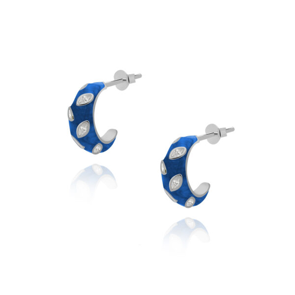 Kolczyki koła srebrne granatowe. Biżuteria wykonana z najwyższej próby srebra 925 – bez dodatku niklu, nie uczula. Kolczyki pokryte 3 warstwami 24 karatowego złota. Średnica koła: 13 mm. Zapinane na sztyft. Biżuteria modowa ozdobiona granatową emalią jubilerską oraz cyrkoniami o przejrzystości: AAAAA+, klasa pierwsza. Wysokiej klasy cyrkonia nadaje delikatny błyszczący efekt. Wyrób jubilerski wykonany z ogromną precyzją przez mistrzów jubilerstwa.