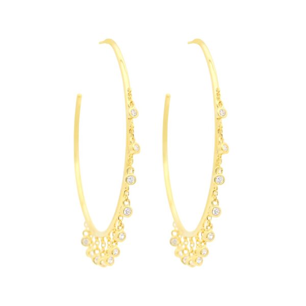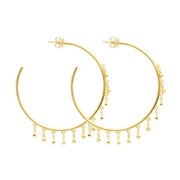 Kolczyki wykonane ze srebra próby 925, dodatkowo pokryte warstwą 18 karatowego złota. Kolczyki ozdobione cyrkoniami. Średnica kolczyków: 55 mm. Średnica cyrkonii: 2 mm. Zapięcie na wkręt.