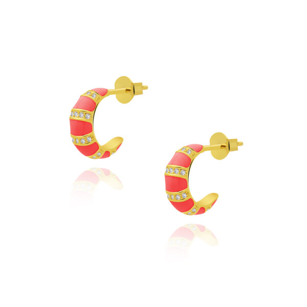 Kolczyki koła srebrne pozłacane malinowe z cyrkoniami. Biżuteria wykonana z najwyższej próby srebra 925 – bez dodatku niklu, nie uczula. Kolczyki pokryte 3 warstwami 24 karatowego złota. Średnica koła: 13 mm. Zapinane na sztyft. Biżuteria modowa ozdobiona malinową emalią jubilerską oraz cyrkoniami o przejrzystości: AAAAA+, klasa pierwsza. Wysokiej klasy cyrkonia nadaje delikatny błyszczący efekt. Wyrób jubilerski wykonany z ogromną precyzją przez mistrzów jubilerstwa.