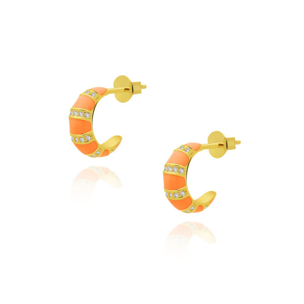 Kolczyki koła srebrne pozłacane pomarańczowe z cyrkoniami. Biżuteria wykonana z najwyższej próby srebra 925 – bez dodatku niklu, nie uczula. Kolczyki pokryte 3 warstwami 24 karatowego złota. Średnica koła: 13 mm. Zapinane na sztyft. Biżuteria modowa ozdobiona pomarańczową emalią jubilerską oraz cyrkoniami o przejrzystości: AAAAA+, klasa pierwsza. Wysokiej klasy cyrkonia nadaje delikatny błyszczący efekt. Wyrób jubilerski wykonany z ogromną precyzją przez mistrzów jubilerstwa.