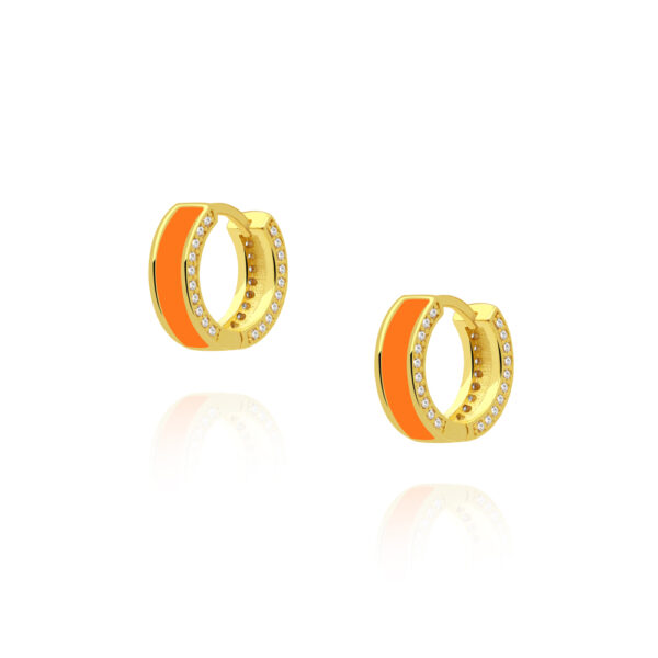 Kolczyki koła srebrne pozłacane z pomarańczową emalią i cyrkoniami wykonane z najwyższej próby srebra 925 – bez dodatku niklu, nie uczulają. Kolczyki pokryte 3 warstwami 24 karatowego złota. Średnica kolczyków: 13 mm. Zapinane na zapięcie francuskie. Biżuteria modowa ozdobiona pomarańczowa emalią jubilerską oraz cyrkoniami o przejrzystości: AAAAA+, klasa pierwsza. Wysokiej klasy cyrkonia nadaje delikatny błyszczący efekt. Biżuteria modowa wykonana z ogromną precyzją przez mistrzów jubilerstwa.