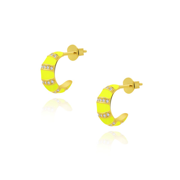 Kolczyki koła srebrne pozłacane żółte z cyrkoniami. Biżuteria wykonana z najwyższej próby srebra 925 – bez dodatku niklu, nie uczula. Kolczyki pokryte 3 warstwami 24 karatowego złota. Średnica koła: 13 mm. Zapinane na sztyft. Biżuteria modowa ozdobiona żółtą emalią jubilerską oraz cyrkoniami o przejrzystości: AAAAA+, klasa pierwsza. Wysokiej klasy cyrkonia nadaje delikatny błyszczący efekt. Wyrób jubilerski wykonany z ogromną precyzją przez mistrzów jubilerstwa.