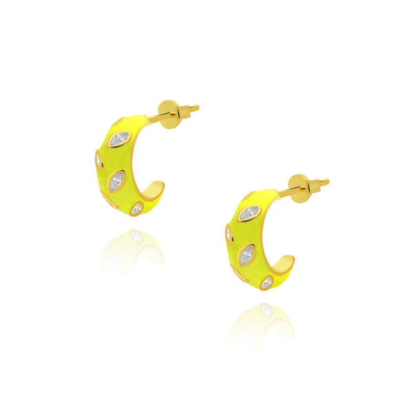 Kolczyki koła srebrne pozłacane żółte. Biżuteria wykonana z najwyższej próby srebra 925 – bez dodatku niklu, nie uczula. Kolczyki pokryte 3 warstwami 24 karatowego złota. Średnica koła: 13 mm. Zapinane na sztyft. Biżuteria modowa ozdobiona żółtą emalią jubilerską oraz cyrkoniami o przejrzystości: AAAAA+, klasa pierwsza. Wysokiej klasy cyrkonia nadaje delikatny błyszczący efekt. Wyrób jubilerski wykonany z ogromną precyzją przez mistrzów jubilerstwa.