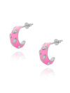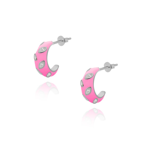 Kolczyki koła srebrne różowe. Biżuteria wykonana z najwyższej próby srebra 925 – bez dodatku niklu, nie uczula. Kolczyki pokryte 3 warstwami szlachetnego rodu. Średnica koła: 13 mm. Zapinane na sztyft. Biżuteria modowa ozdobiona różowaą emalią jubilerską oraz cyrkoniami o przejrzystości: AAAAA+, klasa pierwsza. Wysokiej klasy cyrkonia nadaje delikatny błyszczący efekt. Wyrób jubilerski wykonany z ogromną precyzją przez mistrzów jubilerstwa.