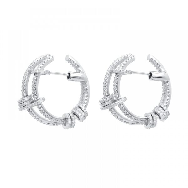Kolczyki wykonane ze srebra próby 925, dodatkowo uszlachetnione rodem. Kolczyki ozdobione białą cyrkonią. Wielkość kolczyków 28×25 mm.